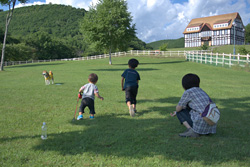 道の駅に隣接して芝生の大きな公園があるので、ゆずの散歩を兼ねて、出発前にチビ2人を遊ばせようと向かっていたら、雨が…。 今日は、一日雨模様らしい。