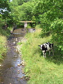橋の前後はすっかり草に覆われ、自然に還ってしまった感がありますが、よく見ると築堤の形もわかります。 近くでは牛が放牧されており、こちらをかわいい目で珍しそうに見ていました。 背景に列車が通れば、とても絵になりそうな場所ですね・・・。