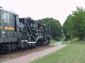 現在は名寄公園の敷地になり、伝説の排雪列車「キマロキ」編成が当時の線路の位置に展示されています。 先頭は私の愛する「キューロク」こと9600型蒸機、初めて編成で見ることができ感動でした。 先の遊歩道になっている切り通しも、いかにも線路跡な雰囲気です。
