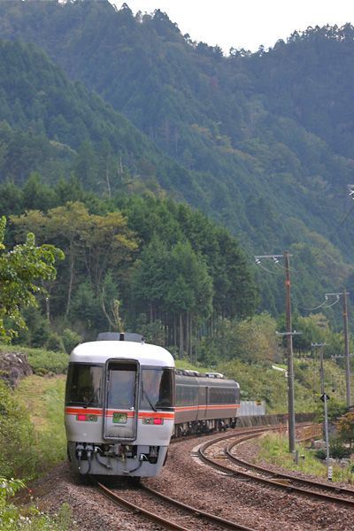 キハ85系の「ワイドビュー ひだ」。 ここは複線になっていますが駅ではなく、交換用の信号所のようです。 運悪く付属編成が連結されておらず、後追いで撮るとこの貫通型の顔でした。 貫通幌フェチのnyaponはこれも嫌いではないですが、このアングルならば「ワイドビューな」顔を押えておきたかったなと・・・。