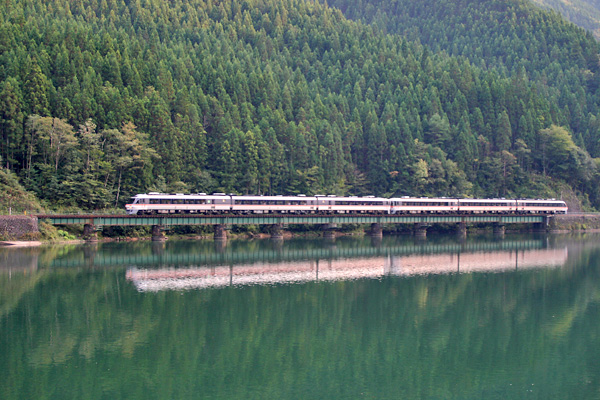 ダムの湖面が水鏡になって編成が美しく映る・・・予定だったのですが、肝心な列車が被写体ブレを起こしてしまいました。 nyamoにはワンテンポだけレリーズのタイミングが早かった事など、お勉強になったようです。