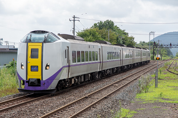 苫小牧港でフェリーを下船したら、その足で室蘭本線の無人駅へ直行。 上下の特急「北斗」の通過を見物できました。 本当は室蘭以西の非電化区間で見たかったところですが、地平線まで続くような直線区間を遠くから高速で迫ってくる列車は、迫力ものでした。